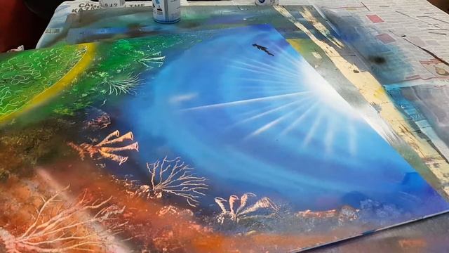 Underwater world with hammer head sharks lurking around for prey. Spraypaint artwork on Canvas.