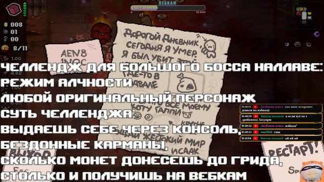 Ссылочка на тг: https://t.me/nallawe Ссылка на твич: https://www.twitch.tv/nallawe Ссылка для тех кто хочет скинуть мне на BEER: https://www.donationalerts.com/r/nallawe Ссылка для ценителей мемов: https://memealerts.com/Nallawe Недоделанный Discord: https://discord.gg/AHh9E4DqpP Больше контента: Плейлист по The Binding of Isaac: Repentance: https://youtube.com/playlist?list=PL31GJ58dz7oLnlkBbJhewEvRQKT-kxS4V Плейлист по Лиге легенд: https://youtube.com/playlist?list=PL31GJ58dz7oLUGWkoGc2wFwQefzYZ81ZT Правила: Запрещено: 1) Использование чрезмерного количества смайликов (допустимо 6 смайлов) = предупреждение/повторный спам = мут. 2) Не спамте (спам тремя одинаковыми сообщениями) = предупреждение/повторный спам = мут, потом бан. 3) Оскорбления в адрес стримера/зрителей = мут, повторное = бан 4) Если вы будучи забаненным или у вас мут, зайдете с другого аккаунта и нарушите любое правило, то сразу получите бан на два аккаунта (даже если на первом у вас был мут). Айзек 1. Vik's inc 2 011 ₽ 2. Not me 1 000 ₽ 3. Alonec 788 ₽ 4. DoBeerMan 200 ₽ 5. Омичка 150 ₽ 6. Дед Максим 110 ₽ 7. йа твой папещик 100 ₽ 8. HitoNotYakuto 100 ₽ 9. MAKE▶PLAY 70 ₽ 10. kóstur 50 ₽ 11. Девочка софт-гранж 50 ₽ 12. Tweety 50 ₽ 13. Arssent 50 ₽ 14. Максим 50 ₽ 15. else 50 ₽ 16. TheFallen 50 ₽ 17. Эндрю 30 ₽ 18. я 25 ₽ 19. MyCatSugar 20 ₽ Спасибо вам