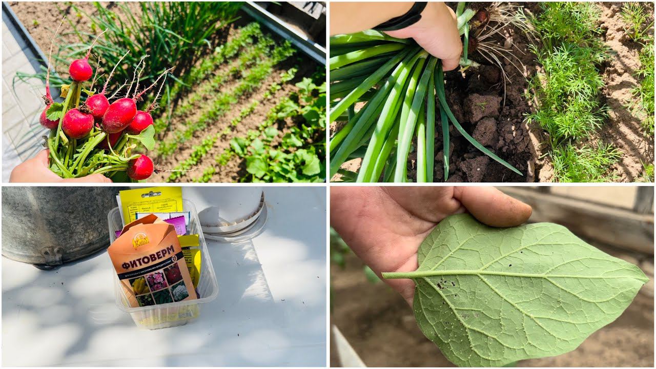 9 июня. На даче. Постелили новый ковролин. Уборка в доме. Подвязала помидоры. Тля. Тля на баклажанах. Сбор редиски.