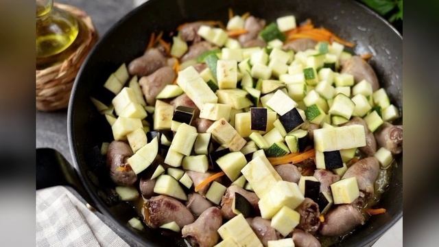 Куриные 🐔 сердечки 🫀 с овощами🥗 Необходимые продукты: - Куриные сердечки 500 г🐔🫀 - Лук репчатый 50 г🧅 - Морковь 50 г🥕 - Баклажан 100 г🍆 - Кабачок 1 шт.🥬 - Помидоры 100 г🍅 - Чеснок 1 зубч.🧄 - Укроп, петрушка 4 ветк.🌿 - Соль и перец по вкусу🧂 - Масло растительное 2 ст.л.🏺 - Вода (бульон) 100 г🍶 Процесс приготовления: 1. Подготовьте все необходимые продукты. Овощи почистите, помойте и обсушите. Обрежьте лишний жир и капилляры на сердечках. Тоже помойте и обсушите их. 2. Разогрейте в сковороде растительное масло, положите в него сердечки и жарьте минут 5. Нужно чтобы потрошки полностью побелели и слегка подрумянились. 3. Нашинкуйте тонко лук и морковь, добавьте в сковороду. Тушите на умеренном огне еще минут 5. 4. Баклажаны и кабачок нарежьте мелким кубиком, переложите к сердечкам. Жарьте еще минут 5, время от времени подливая понемногу воду или овощной бульон. 5. Помидоры порежьте таким же мелким кубиком, переложите в сковороду, добавьте измельченный или раздавленный зубчик чеснока. Тушите последние 5 минут. В процессе посолите и поперчите блюдо по своему вкусу. 6. Нарубите свежую зелень, всыпьте в сковороду, перемешайте и выключите плиту. Оставьте сердечки с овощами под крышкой, чтобы они максимально пропитались вкусом и ароматом овощей, чеснока и трав. 7. Разложите готовое блюдо по порциям и подавайте к столу со свежим хлебушком и любимым гарниром. Очень вкусно! Если есть возможность можете поддержать ДОНАТОМ ➕ СОХРАНИ рецепт, и поделись с ДРУЗЬЯМИ