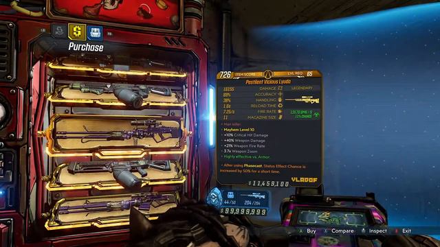 This week the vending machine is located on Ascension Bluff. You can find this zone on Pandora. The machine is in Mouthpiece's building. The Lydua sniper rifle (Vladof), the Kaos assault rifle (Dahl), and the Hex grenade are offered this week.