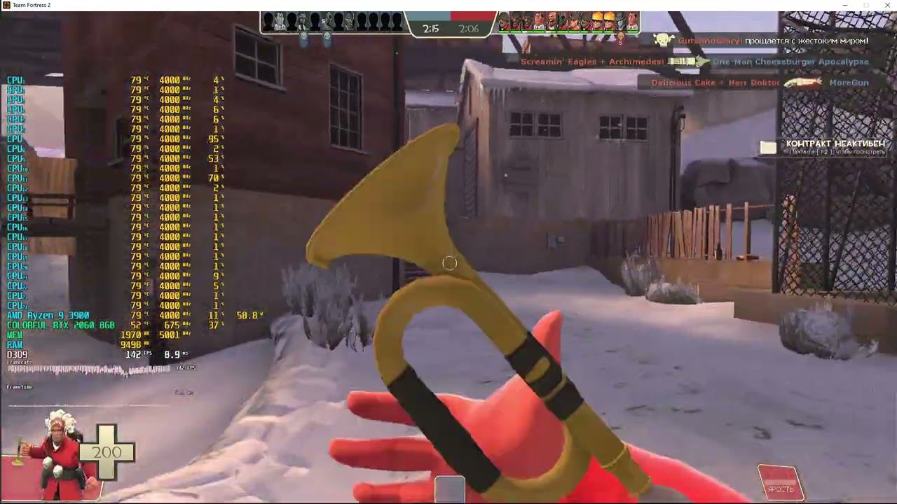 Game: Team Fortress 2 A CONVINCING REQUEST: If you have the correct undervolting of the Ryzen 9 3900 processor, I will be happy to shoot another video about frame stability Сomputer characteristics: Socket: AM4 Motherboard: Asus Prime b450m-a Processor: Ryzen 9 3900 4.0GHZ UNDERVOLTING 1.181 CPU VOLTAGE, If you remove this setting, the processor temperature will be from 90 degrees to 95 with a decrease in frequencies, so I chose 1.181 volts for the processor. Liquid cooling systems: ID-Cooling FROSTFLOW X 360 RAM: KILLSRE 64GB DDR4 DIMM 3200MHZ GPU: COLORFUL RTX 2060 SUPER 8GB ROM: HDD 500GB OS +HDD 1TB for games Video in 1920x1080 resolution. Operating system: Windows 10 Pro