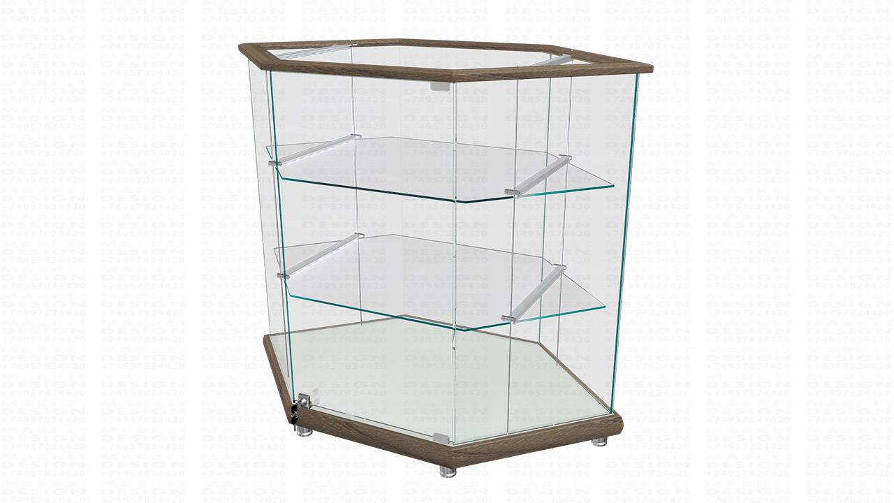 Шестиугольный стеклянный прилавок с диодной подсветкой. Внутри расположены 2 стеклянные полки без регулировки по высоте. Стеклянная дверь распашная, закрывающаяся на замок. Нижняя часть сделана из мдф толщиной 18мм., верхняя из стекла. Толщина стекла 6 мм, обработка края стекла полировка (евро кромка). В прилавке предусмотрены точечная подсветка каждой полки и зеркальная задняя стенка. Большой выбор расцветок. https://www.market-design.ru/vitriny/steklyannye-vitriny-rejn/