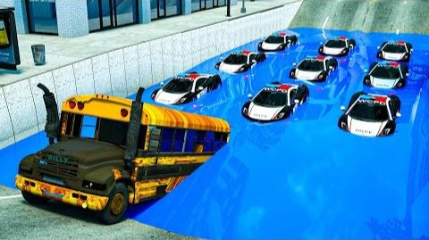 Полицейская машина перепрыгнула через большую лужу, школьный автобус перепрыгнул через большую лужу