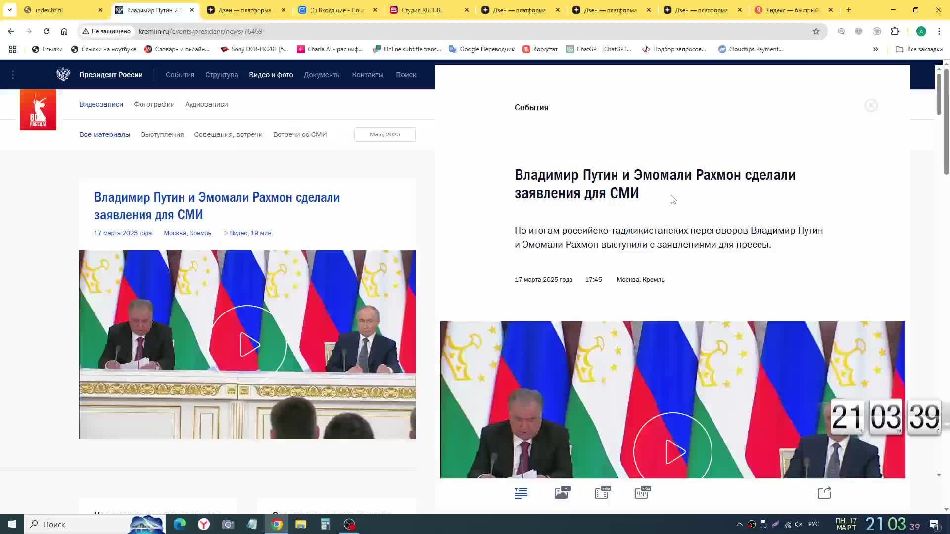 По итогам российско-таджикистанских переговоров Владимир Путин и Эмомали Рахмон выступили с заявлени