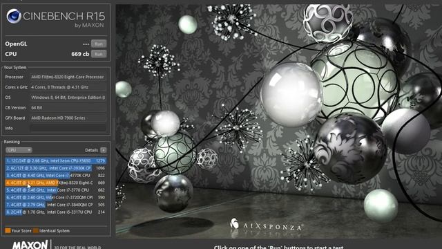 FX8320 4.3Ghz All cores ON = 4 Modules/ 8 Cores / 8 Threads L2 Cache =8 Mb / L3 Cache = 8Mb Overclock 205*21=4305Mhz / Dual 4GB Kingston DDR3 1640 Mhz 11 11 11 30 clocks. Motherboard MSI 970A-G46 Latest bios. Results 684pts FX8320@4.3 (i7 3770 stock 662pts) Other setting watch in video.