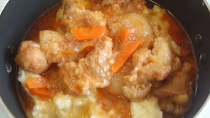 1-2 ст.л раст.масла 2 зуб.чеснока 1 лук 1-2 моркови 2 ст.л том.пасты 1 лавровый лист 1ч.л сладкой паприки щепотка каянского перца чёрный перец орегано майоран 1ч.л сахара соль 1 кг свинины 2 ст.л муки масло для обжарки 1-1,5л воды Салат 0,5ч.л горчица 1ч.л мёда 1ст.л сок лайма или лимона 2-3 ст.л раст.масла 1ст.л бальзамический соус листья салата пол болгарского перца 1-2 огурца редис помидоры петрушка укроп зелёный лук обжаренный кунжут Толчёнка https://bit.ly/3DtyHZ6 Тёрка https://amzn.to/3sw5SVy