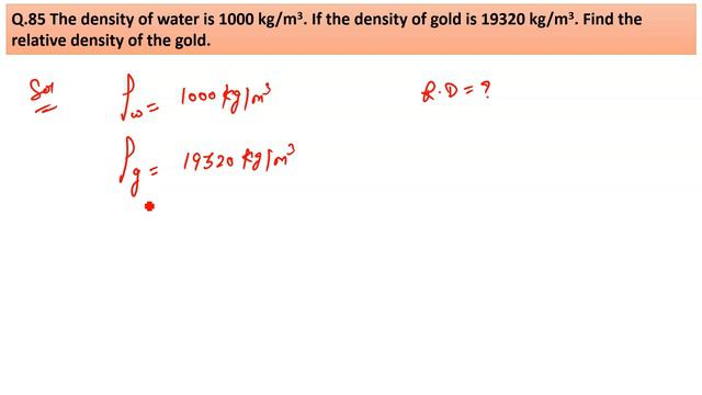Q.85 The density of water is 1000 kg/m3. If the density of gold is 19320 kg/m3. Find the relative density of the gold. #gravitationclass9 #gravitationclass9numericals