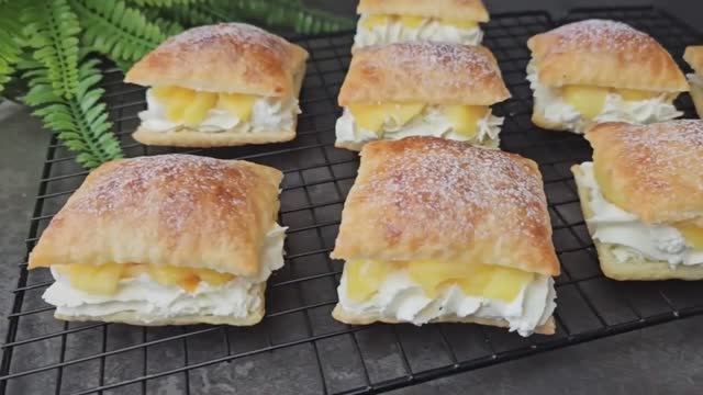 ИНГРЕДИЕНТЫ 0:09 - 2 яблока; 0:20 - 2 столовые ложки лимонного сока; 0:27 - 2 столовые ложки сахара; 0:35 - 1 чайная ложка масла; 0:48 - 1 столовая ложка джема; 1:15 - слоеное тесто; 1:24 - молоко; 2:00 - сахар. Выпекать при температуре 200°C в течение 15 минут. 2:39 - 250 г маскарпоне; 2:43 - 200 мл подслащенных взбитых сливок; 4:27 - сахарная пудра.