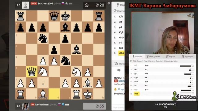 Ежемесячный женский турнир организуемый Александрой Костенюк и chess.com. 9 туров, 3+2 контроль времени. Победительница каждого ежемесячного турнира получает приглашение в финал, который состоится 8 марта 2021. Гарантированный призовой фонд финала – 1000$. Поддержать канал: https://www.donationalerts.com/r/karinachess1 Подписаться на мой канал: https://www.youtube.com/channel/UChor8u_hhgrjX2lt0QLzZHA?sub_confirmation=1 Рестрим: https://www.twitch.tv/karinachess1 Рада приветствовать Вас на канале женского международного гроссмейстера, международного мастера Карины Амбарцумовой! Я - профессиональная шахматистка и тренер. Здесь вы сможете найти обучающие видеоуроки по шахматам, комментарии турниров, стримы моей игры в блиц шахматы. Подписывайтесь на мои странички в соц.сетях: ВКонтакте: https://vk.com/karinachessclub Twitch: https://www.twitch.tv/karinachess1 Почта для связи: karinachess@mail.ru Поддержать канал: https://www.donationalerts.com/r/karinachess1 Мой сайт: http://chesscoach.ru/