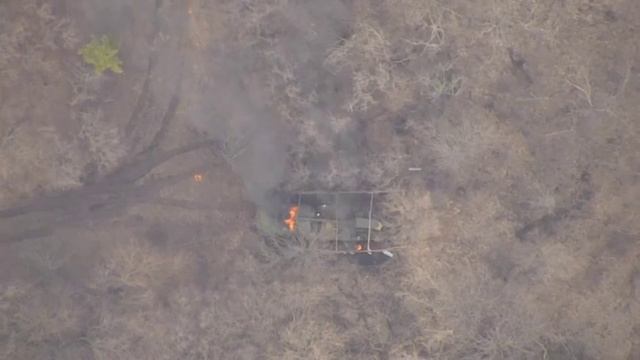 Довольно редкий на ЛБС экземпляр - украинская САУ "Богдана" догорает где-то в лесах Слобожанщины.