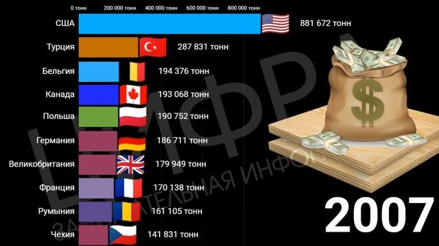 Статистика показывающая страны-лидеры по импорту фанеры за период с 1995 по 2020 год. Метрика: тонна
