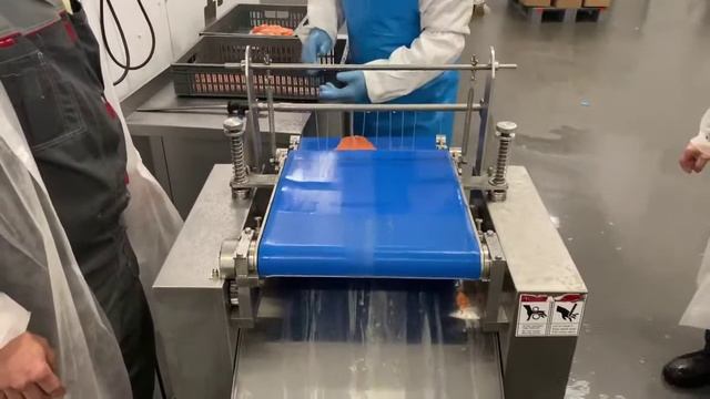 Шкуросъемная машина для удаления шкуры у красной рыбы. Первое видео.